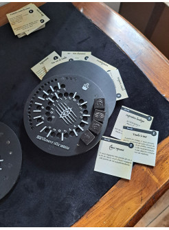 "Ce compteur de sorts de 12 cm de diamètre possède un nombre précis d'emplacements de sorts ( selon les règles de D&D 5), et chacun de ces trous permet de mettre un petit pion, qui correspond à un sort. A côté de chaque trou vous trouverez un nombre entre 1 et 9, qui indique le niveau de sort max autorisé à cet emplacement.