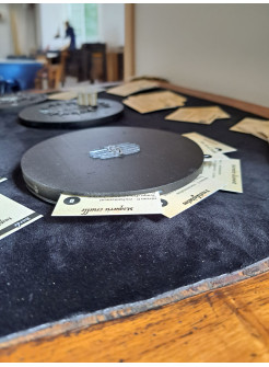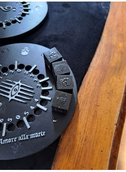 J'ai également modélisé un "porte cartes de sort " qui se place dessous le compteur. Du même diamètre que ce dernier , il porte des cartes qui résument les sorts que j'ai choisi. Au début j'étais parti sur des formats "cartes de poker", mais très vite j'ai vu que ce n'était pas assez compact pour moi, j'ai donc fait mes propres cartes !